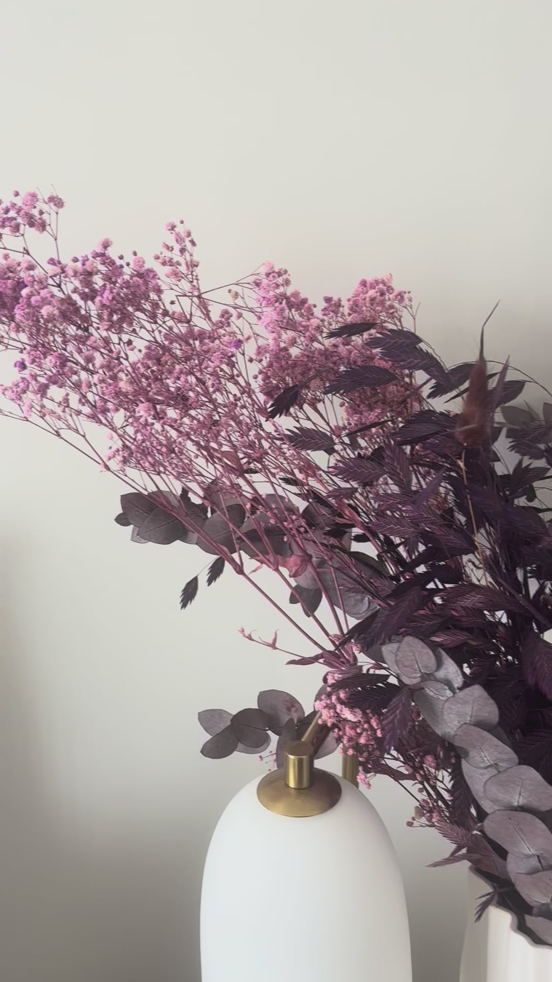 Preserved and dried floral arrangement made up of burgundy gum, rice flowers, bunny tails, nigella, sea oats & babies breath. She is a whimsical and feminine masterpiece