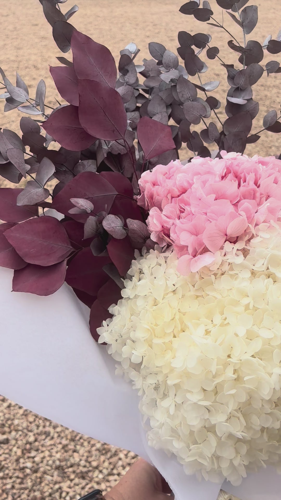 Preserved floral arrangement made up of vibrant pink and white hydrangeas & burgundy gum variations.
