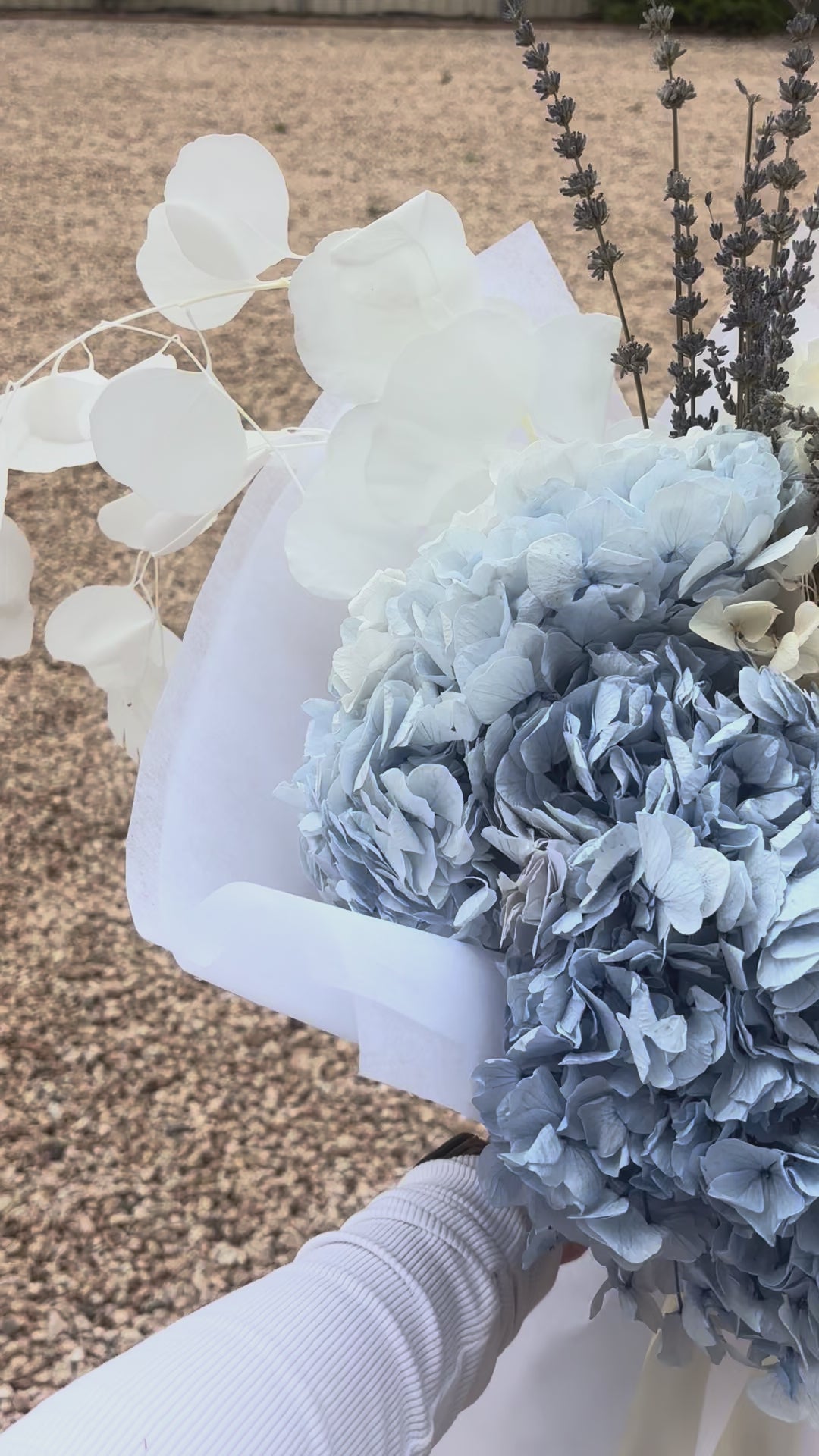 Preserved floral arrangement made up of vibrant coloured hydrangeas, poly gym & dried lavendar.
